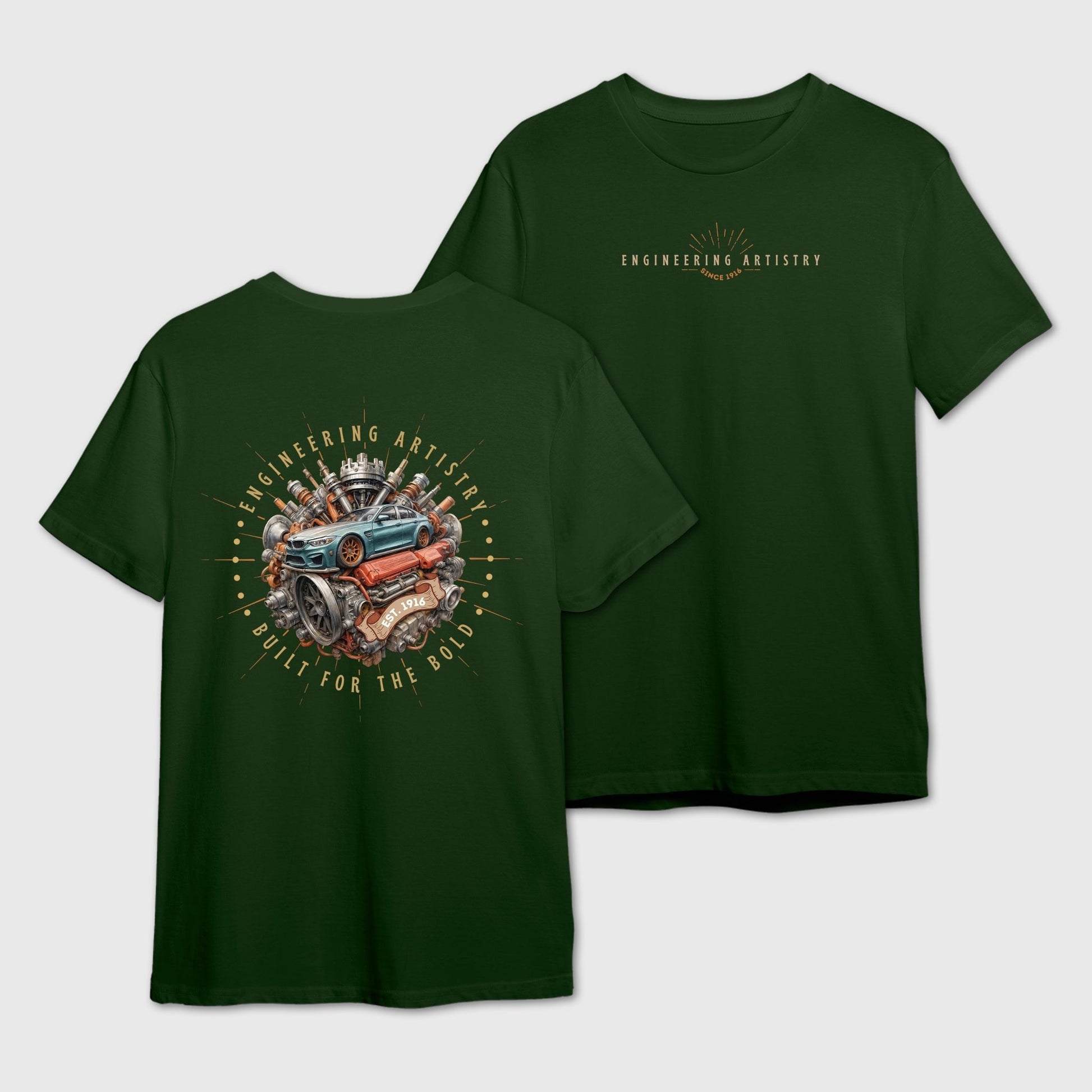 This striking design celebrates the power and precision of BMW's automotive engineering, established in 1961. Featuring a detailed illustration of a car engine intertwined with mechanical elements and crowned with a piston, it embodies the artistry behind high-performance BMW cars in Vintage Beige colors. The text "Engineering Artistry" and "Built for the Bold" speaks to those who appreciate the intricate mechanics and the thrill of the drive. Perfect for car enthusiasts, mechanics, engineers, and anyone who loves a bold and detailed circular design.